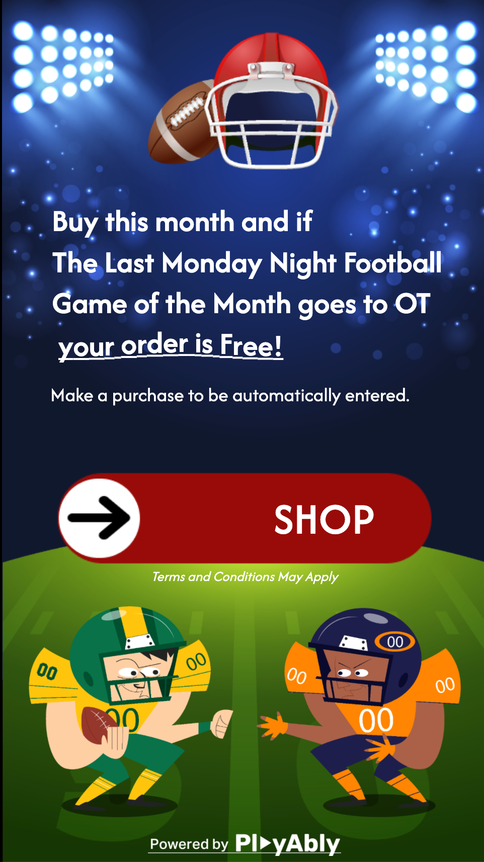 A Gamified Rebates campaign tied to a live college football game. Fans bought at full price, with purchases refunded only if a specific game outcome occurred — fully insured by PlayAbly.